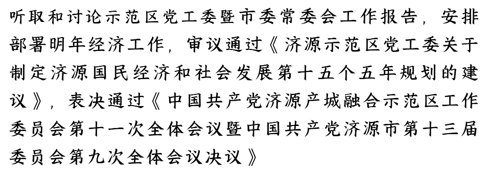 会议以习近平新时代中国特色社会主义思想为指导,深入学习贯彻党的二十届四中全会精神和中央经济工作会议精神,全面落实习近平总书记在河南考察时重要讲话精神和关于河南工作的重要论述,贯彻落实省委十一届十次全会精神和省委经济工作会议精神,听取和讨论了徐衣显受示范区党工委暨市委常委会委托所作的工作报告,总结2025年示范区经济工作,分析当前经济形势,部署2026年经济工作,讨论了示范区党工委暨市委常委会2025年抓党建工作专题报告,审议通过了《济源示范区党工委关于制定济源国民经济和社会发展第十五个五年规划的建议》。徐衣显就《建议(讨论稿)》向全会作了说明。