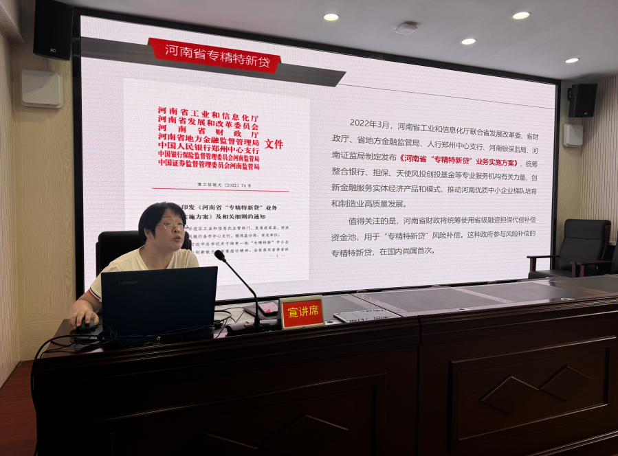 工科局运行局局长李敏宣传讲解“专精特新贷”方案和《河南省中小微企业发展促进条例》。
